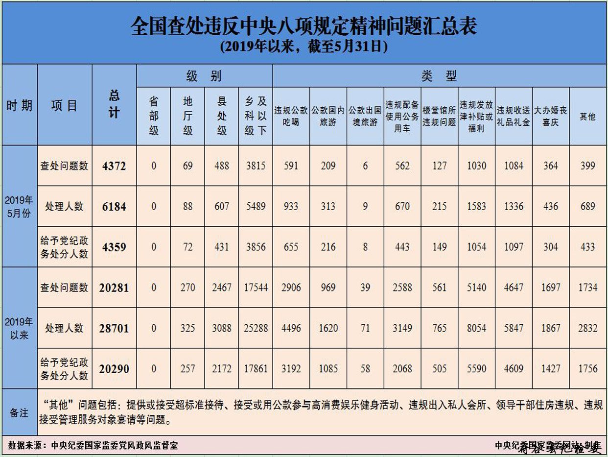 为掌握全国贯彻落实中央八项规定精神情况,中央纪委在各省区市和新疆生产建设兵团、各中央和国家机关、各中央企业和中央金融企业等建立了落实中央八项规定精神情况月报制度。2019年以来,截至5月31日,全国查处违反中央八项规定精神问题情况如下: