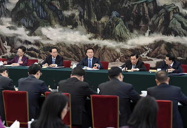 3月7日,中共中央政治局常委、国务院副总理韩正参加十三届全国人大二次会议浙江代表团的审议。新华社记者 高洁 摄