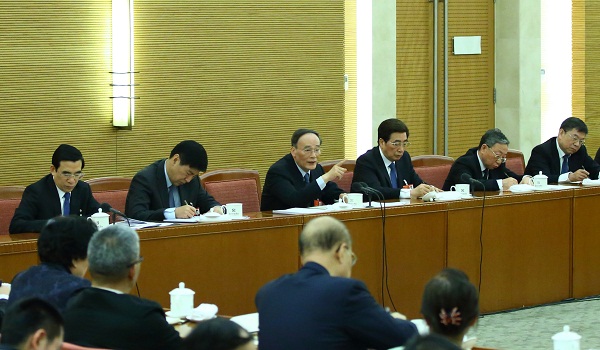 3月6日,中共中央政治局常委、中央纪委书记王岐山参加十二届全国人大四次会议北京代表团的审议。(新华社记者 丁海涛 摄)
