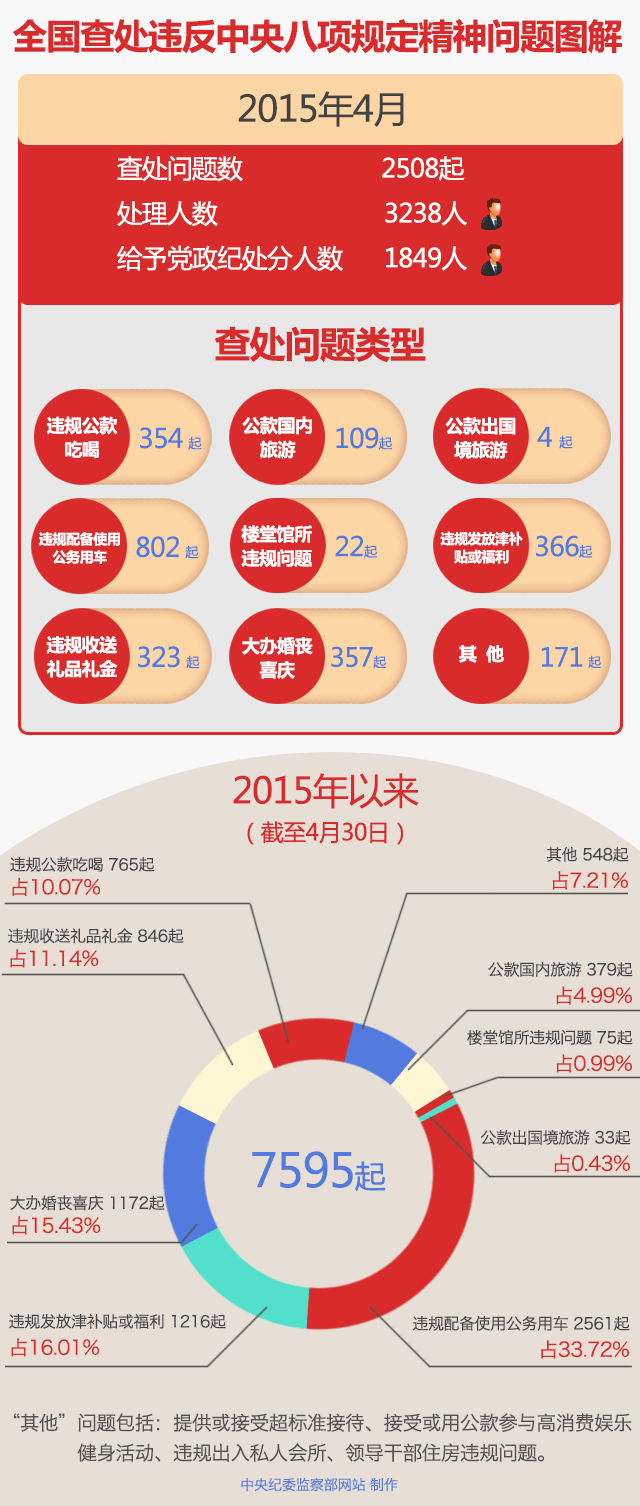 2015年4月全国查处违反中央八项规定精神问题2508起。