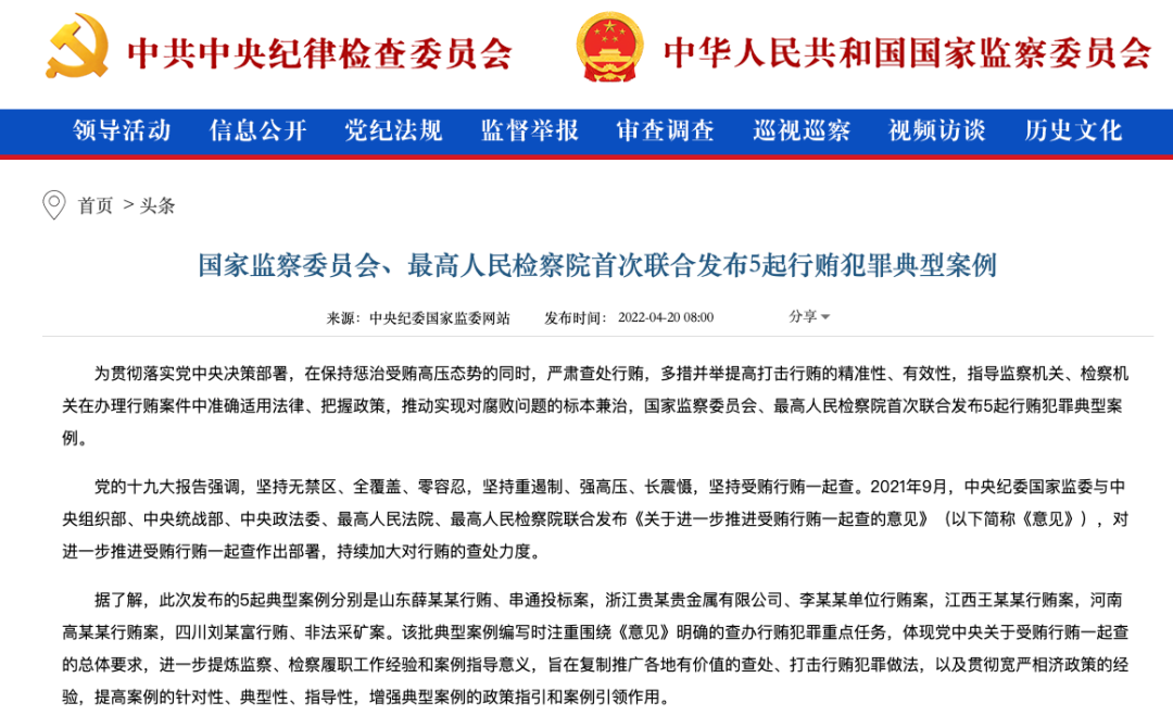 在3月29日,中央纪委国家监委、最高检联合发布5起行贿犯罪典型案例。