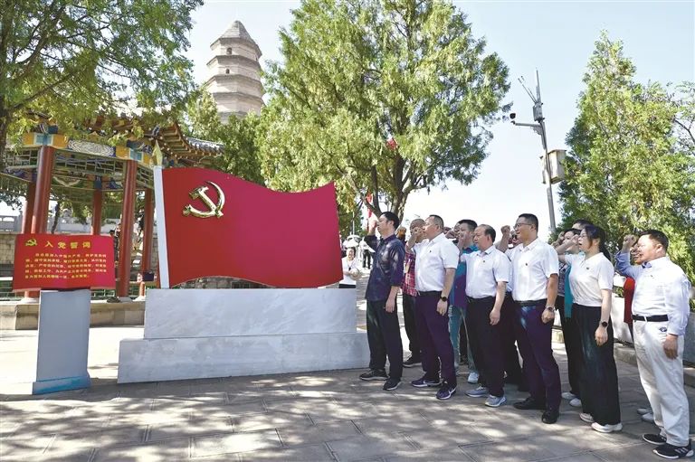 面对新征程上的新挑战新考验,党要永葆蓬勃朝气,就必须始终坚持问题导向,保持战略定力,发扬彻底的自我革命精神,把党的伟大自我革命进行到底。图为党员干部在陕西延安宝塔山重温入党誓词。新华社记者张博文摄