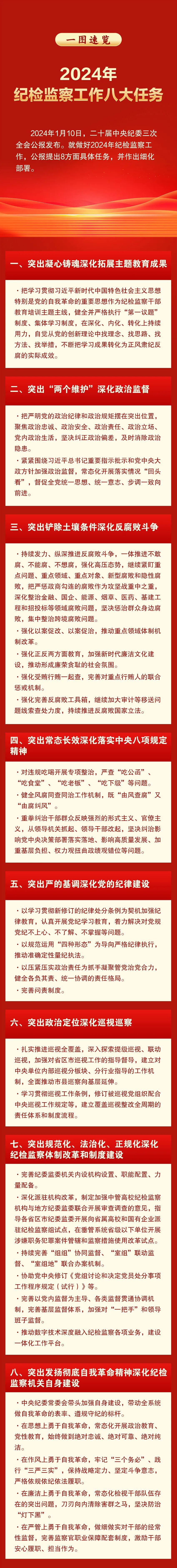 2024年1月10日,二十届中央纪委三次全会公报发布。就做好2024年纪检监察工作,公报提出8方面具体任务,并作出细化部署。详情请看↓↓↓