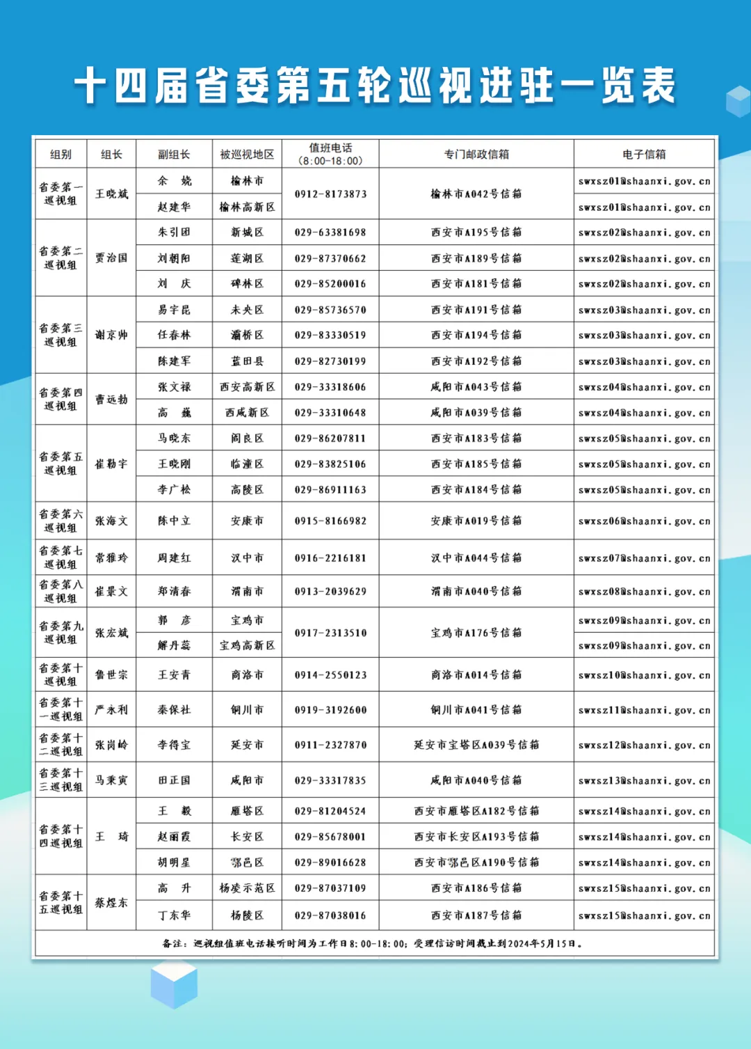 据悉,15个省委巡视组将在被巡视地区工作60天左右,其间设立专门值班电话、邮政信箱、电子信箱和“码上巡”二维码等,主要受理反映被巡视地区党组织领导班子及其成员、下一级党组织主要负责人和重点岗位人员问题的来信来电,重点是关于违反政治纪律、组织纪律、廉洁纪律、群众纪律、工作纪律和生活纪律以及巡视整改等方面问题反映。巡视组受理信访时间截止到2024年5月15日。