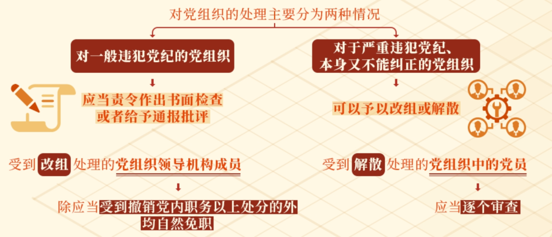 根据《中国共产党纪律处分条例》规定,对党组织的处理主要分为两种情况:对一般违犯党纪的党组织,上级党组织应当责令其作出书面检查或者给予通报批评;对于严重违犯党纪、本身又不能纠正的党组织,上一级党的委员会在查明核实后,根据情节的严重程度,可以予以改组或解散。