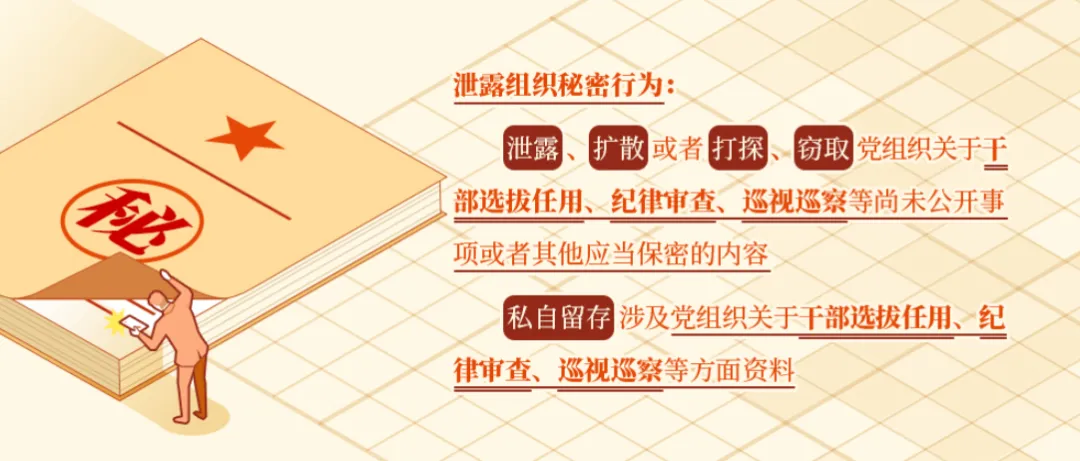 《中国共产党纪律处分条例》第一百四十四条对泄露组织秘密行为作出了处分规定。泄露、扩散或者打探、窃取党组织关于干部选拔任用、纪律审查、巡视巡察等尚未公开事项或者其他应当保密的内容的,给予警告或者严重警告处分;情节较重的,给予撤销党内职务或者留党察看处分;情节严重的,给予开除党籍处分。私自留存涉及党组织关于干部选拔任用、纪律审查、巡视巡察等方面资料,情节较重的,给予警告或者严重警告处分;情节严重的,给予撤销党内职务处分。