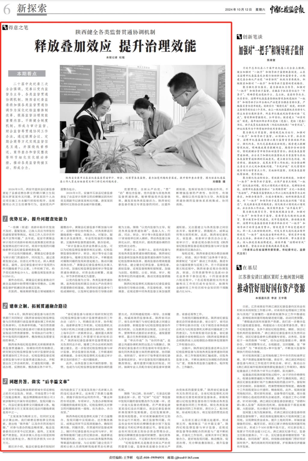 从信息互通让问题无处遁形,到成果互用、做深做实“后半篇文章”,陕西纪检监察监督与审计监督、巡视巡察监督等协调配合的深度与广度不断拓展,在强化工作协同、成果共享中汇聚监督合力,更好地发现问题、推动整改、促进治理,充分释放叠加效应,提升监督质效。