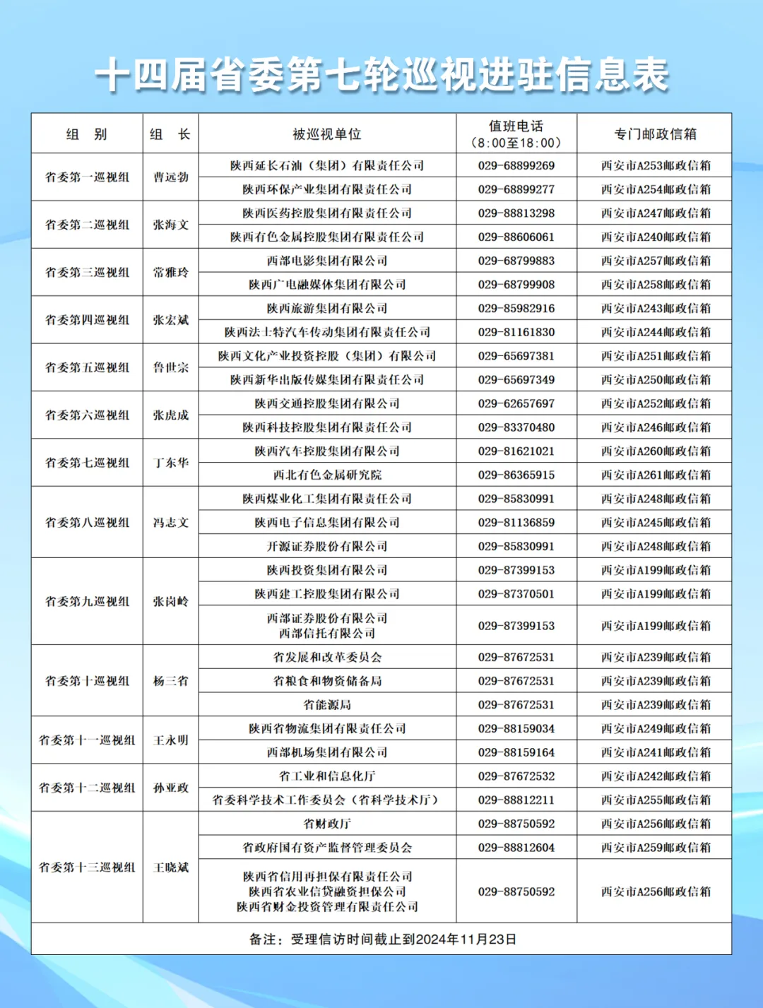 经省委批准,13个巡视组对省发展和改革委员会、省财政厅、省委科学技术工作委员会(省科学技术厅)、省工业和信息化厅、省政府国有资产监督管理委员会、陕西延长石油(集团)有限责任公司、陕西煤业化工集团有限责任公司、陕西投资集团有限公司、陕西有色金属控股集团有限责任公司、陕西建工控股集团有限公司、陕西医药控股集团有限责任公司、西部机场集团有限公司、陕西文化产业投资控股(集团)有限公司、陕西旅游集团有限公司、西部电影集团有限公司、陕西广电融媒体集团有限公司、陕西新华出版传媒集团有限责任公司、西北有色金属研究院、陕西科技控股集团有限责任公司、陕西省物流集团有限责任公司、陕西交通控股集团有限公司、陕西电子信息集团有限公司、陕西汽车控股集团有限公司、陕西法士特汽车传动集团有限责任公司等24家单位党组(党委)开展常规巡视;对省能源局、省粮食和物资储备局、陕西环保产业集团有限责任公司等3家单位党组(党委)开展提级巡视;对省财政厅下属的陕西省信用再担保有限责任公司、陕西省农业信贷融资担保有限公司、陕西财金投资管理有限责任公司,陕西煤业化工集团有限责任公司下属的开源证券股份有限公司,陕西投资集团有限公司下属的西部证券股份有限公司、西部信托有限公司等6家金融企业党委进行专题了解。