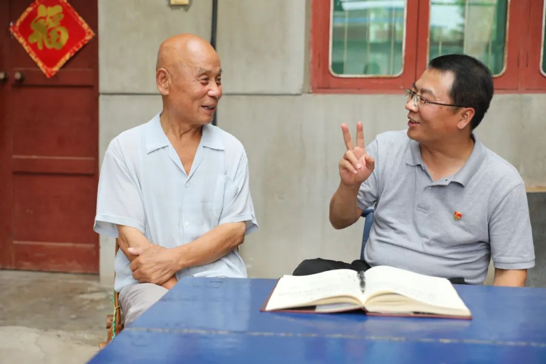 张向学(右)正在听取老党员对村子发展的意见建议。武利芳 摄