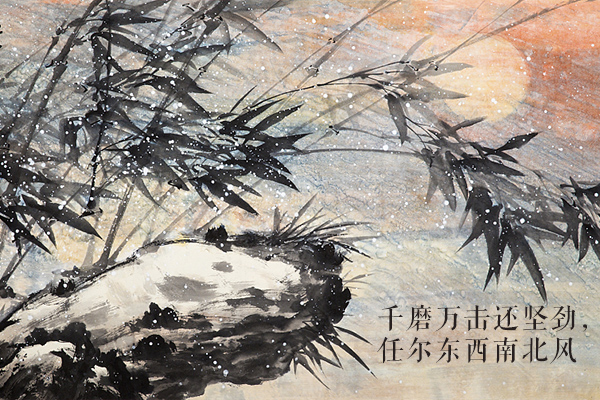 《竹石》是郑板桥的一首题画诗,也是一首托物言志的咏物诗。诗人表面上写竹站定青山之上,扎根岩石之中,不管风吹雨打,总是坚劲挺直,实则借竹喻人:一个人无论遇到怎么样的风雨和打磨,也应当不低头,始终保持坚劲挺直,这正是这首《竹石》诗背后的真精神。
