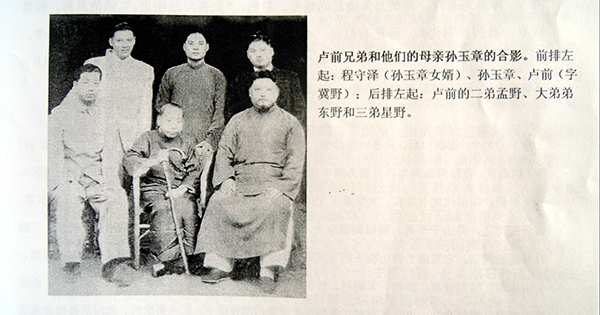 卢崟的曾孙卢前(1905-1951年),字冀野,是我国著名的诗人、学者和教授,素有“江南才子”之称。1925年,卢前的父亲去世。此时,作为长子的卢前,上有寡母,下有年幼的弟妹,需要承担起一家人的生活重担。他始终牢记家规箴言:“易得者田地,难得者兄弟。岂可以易得换我难得乎?……此不可不省悟也!”毕业后,卢前除了在大学教书,还同时兼任其他学校的课务。为多挣些钱补贴家用,四处奔波教学。他的一位好友在文中这样写道:“(卢前)本职任国立暨南大学教授,兼职分在上海、南京……故一星期中,两天在真如,两天在上海,两天在南京,一天在火车上。余笑问之曰:‘不累乎?’其小胡子一皱,微笑而已。”